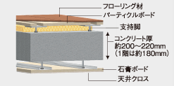 床のコンクリートスラブ厚は分譲マンション並みの200mmで更なる静かさを